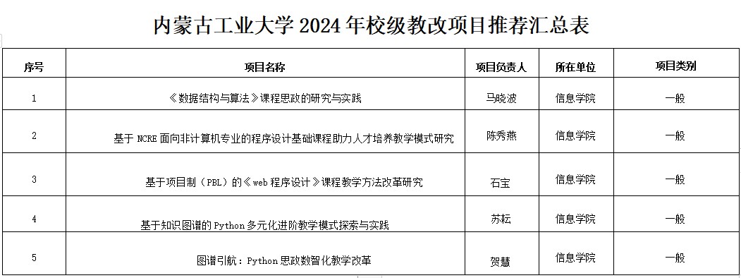 根據《內蒙古工業大學教育教學改革項目管理辦法》(內工大 校發〔2017〕64號)的有關規定和《關于組織開展2024年校級教育教學改革項目申報工作的通知》(內工大 教務字〔2024〕13號)文件要求,在各系(中心)申報推薦的基礎上,經學院本科教學工作委員會綜合評審,現對擬立項的一般項目予以公示,公示時間:2024年6月17日——2024年6月18日。