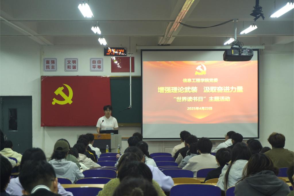4月23日,信息工程學院黨委開展“增強理論武裝 汲取奮進力量”----“世界讀書日”主題黨日活動,學院100余名入黨積極分子和發展對象參加活動。