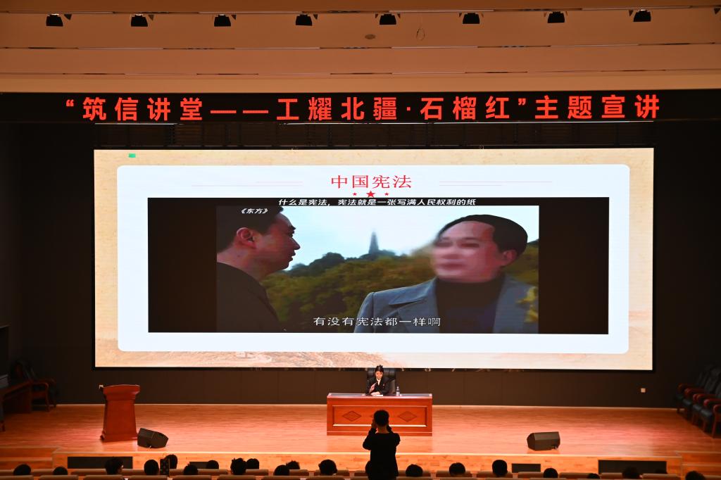 宣講嘉賓緊扣“弘揚憲法精神,維護憲法權威”主題,系統闡釋了憲法的地位作用、發展歷程及其與一般法律的區別,結合典型案例強調全體公民都應當以憲法為根本活動準則,自覺維護憲法尊嚴和權威?;顒蝇F場設置了憲法知識競答環節,師生踴躍參與,互動氣氛熱烈。嘉賓勉勵師生將憲法精神融入專業學習與職業生涯,以實際行動踐行“工耀北疆·石榴紅”主題內涵,筑牢法治信仰,增強民族團結,服務北疆發展。