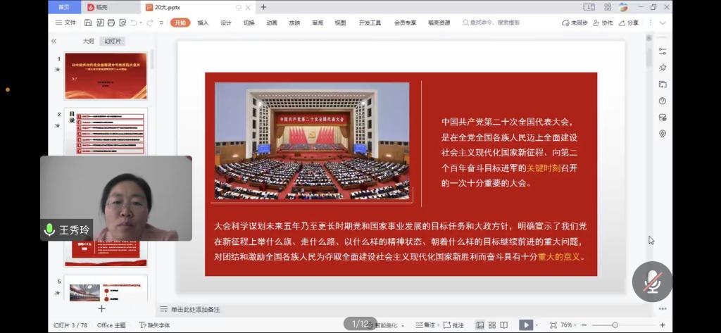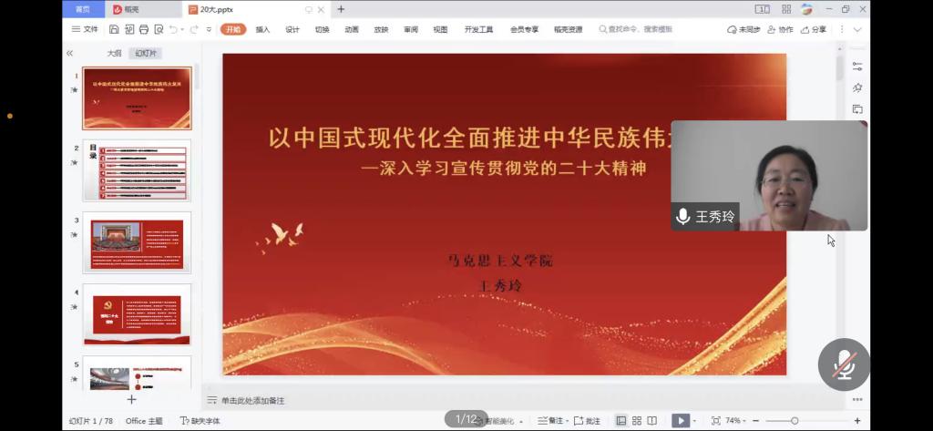 王秀玲教授以“中國式現(xiàn)代化全面推進(jìn)中華民族偉大復(fù)興——深入學(xué)習(xí)宣傳貫徹黨的二十大精神”為題,從大會(huì)的戰(zhàn)略定位、大會(huì)主題、實(shí)踐基礎(chǔ)、理論指導(dǎo)、基本路徑、根本保證以及團(tuán)結(jié)要求等方面,結(jié)合詳實(shí)數(shù)據(jù)、生動(dòng)案例對黨的二十大提出的新思想新論斷、作出的新部署新要求,作了全面宣講和深入闡釋。