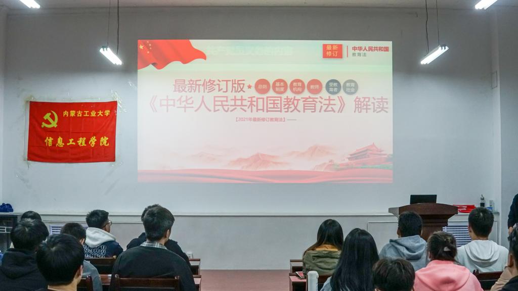 為創(chuàng)造良好的學(xué)校管理秩序、教育教學(xué)秩序和弘揚(yáng)社會(huì)主義法治精神,內(nèi)蒙古工業(yè)大學(xué)信息工程學(xué)院黨委師生黨員于2021年10月6日晚上7點(diǎn)在電力大樓十樓西配,集中學(xué)習(xí)2021年最新修訂的《中華人民共和國(guó)教育法》