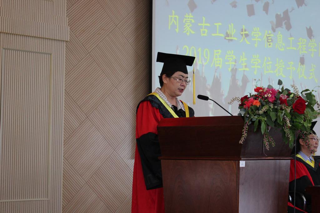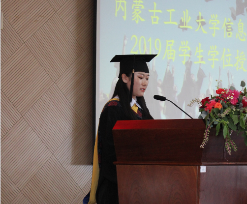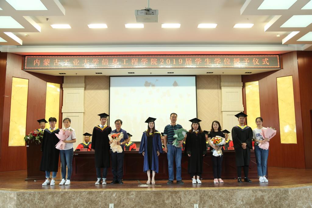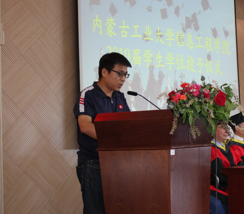 學(xué)位授予儀式在鏗鏘雄壯的國歌聲中拉開序幕。學(xué)院黨委書記王彩玲宣讀《關(guān)于對2019年優(yōu)秀碩士論文、本科畢業(yè)設(shè)計獲得者及指導(dǎo)教師表彰的決定》。學(xué)院領(lǐng)導(dǎo)為獲獎教師及同學(xué)頒發(fā)榮譽證書。物聯(lián)網(wǎng)系教師黃建偉、計算機15-1班劉赟、電子17-1班董國鈺分別代表教師、畢業(yè)生、在校生進行發(fā)言。