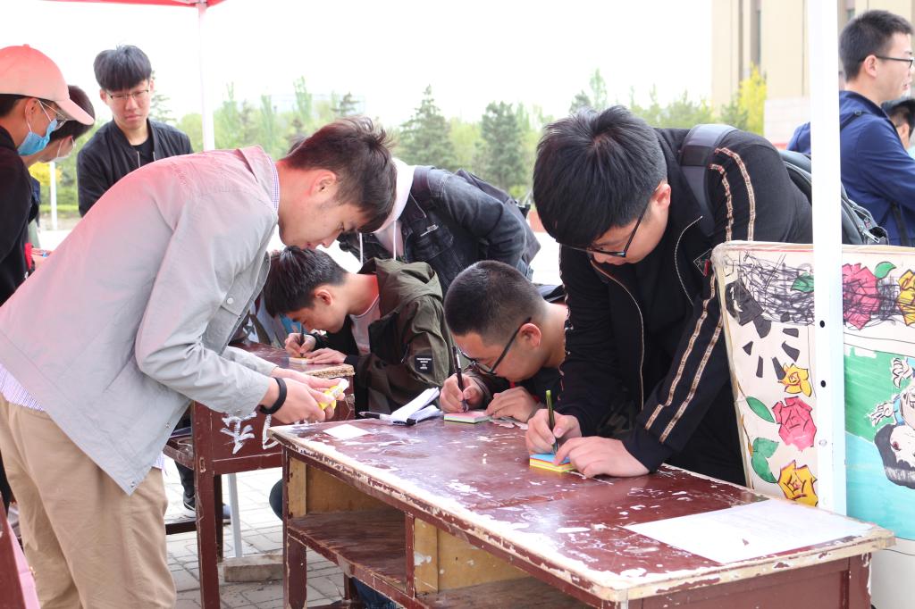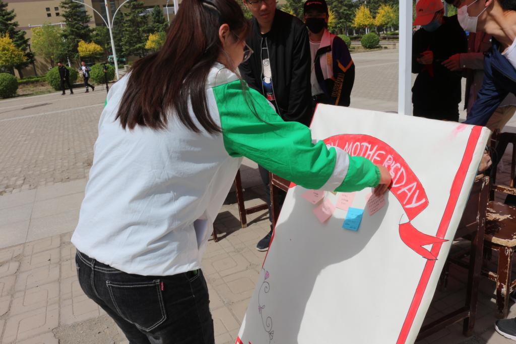 活動開始,同學們紛紛走到活動現場,用筆觸寫下對母親的愛,他們寫下話語,拍照留念,把他們的愛貼在活動板上。有些人還接受了志愿者們的采訪,用音像對母親遙寄祝福。