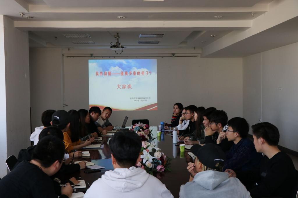 “我的肩膀——能挑多重的擔子?”主題討論會,參會學生干部激情洋溢地講述著自己參與學生干部工作以來收獲的辛酸喜悅,并分享自己部門工作取得的優異成績以及今后的工作思路。討論會的開展為今后學生會工作奠定了堅實的基礎。