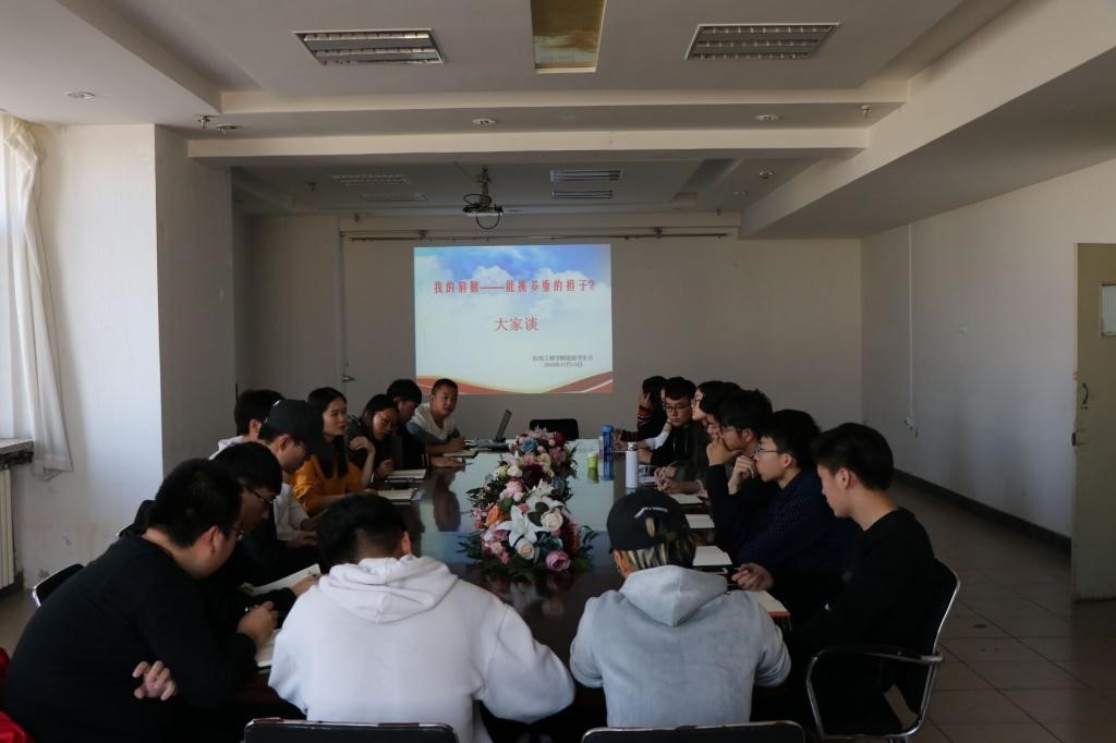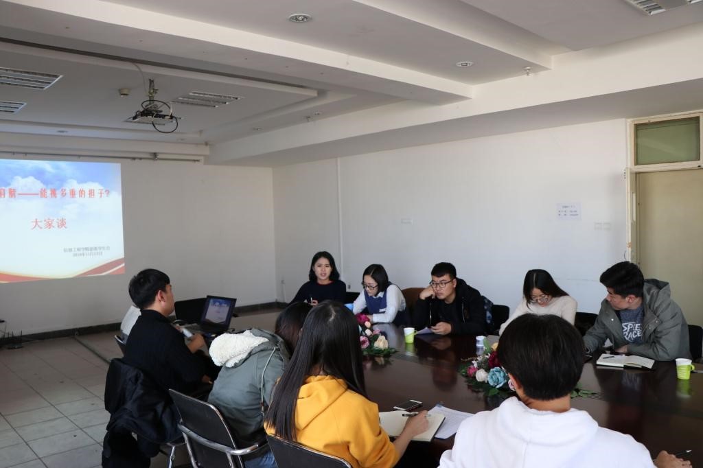 為深入貫徹落實習近平新時代中國特色社會主義思想和黨的十九大精神,教育和引導廣大青年學生愛國、擔當、奮斗,爭做擔當民族復興大任的時代新人,我院團委于11月13日中午在0918會議室召開“我的肩膀——能挑多重的擔子”主題討論會,學生會部長及以上成員參加。