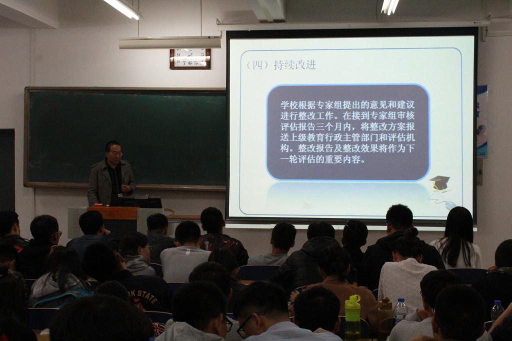 動員會上,學(xué)院副書記、副院長王金彪老師詳細(xì)講解了審核評估的基本概念、目的意義、指導(dǎo)思想、原則理念、專家進(jìn)??疾旃ぷ鞒绦虻龋由盍送瑢W(xué)們對審核評估的認(rèn)識。他介紹了校史校情、院史院情、第二課堂、學(xué)生就業(yè)等專家與學(xué)生訪談中關(guān)注的問題,強(qiáng)化了學(xué)生對學(xué)校和學(xué)院工作的了解和認(rèn)同。王院長對學(xué)生迎評工作提出了五點(diǎn)要求,他要求同學(xué)們端正學(xué)習(xí)態(tài)度,按時上課,不遲到早退、嚴(yán)格遵守課堂紀(jì)律,積極參與互動。加強(qiáng)自我修養(yǎng),嚴(yán)格執(zhí)行學(xué)校各項規(guī)章制度,營造良好的學(xué)習(xí)、生活氛圍。