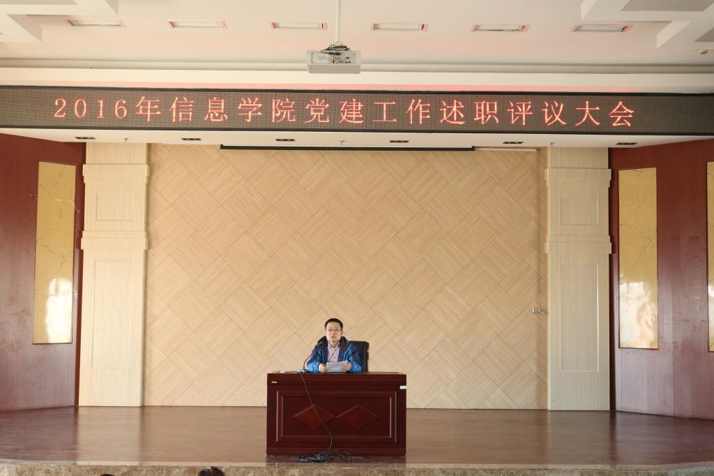 12月29日下午,我院2016年黨建工作述職評議大會在金川校區電力大樓十樓第一報告廳隆重舉行。學院52名教師黨員、136名學生黨員參加了會議。 學院黨委書記彭建兵代表院黨委圍繞一年來黨建工作開展情況、緊扣業務抓好黨建、抓好黨建促發展、本單位黨建工作中存在的問題和下一步工作思路進行述職。