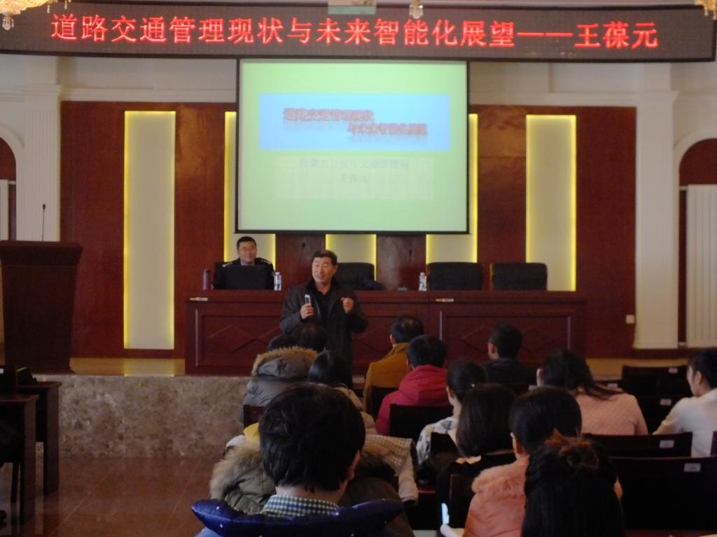 12 月 26 日上午,我院舉辦《道路交通管理現狀及未來智能化展望》學術報告。報告會邀請內蒙古公安廳交通管理局事故處處長、教授級高工王葆元主講,并由學院交通信息工程及控制碩士學位點負責人楊宏業教授主持,孟克副院長,房建東、黃平平教授,韓建峰、白云副教授等出席參加。