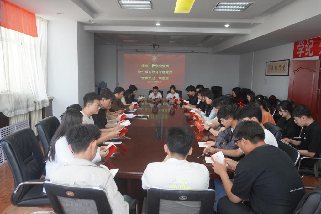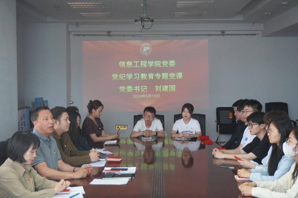 為扎實開展黨紀學習教育,增強師生黨員紀律意識和規矩意識,筑牢師生黨員拒腐防變思想防線,2024年5月16日,信息工程學院黨委書記劉建國在0918會議室為我院師生黨員講授了一堂黨紀學習教育專題黨課。