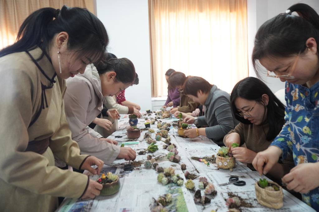 活動(dòng)中,老師為大家講解多肉栽培養(yǎng)護(hù)知識(shí)、種植方法與步驟。女教工們熱情參與,精心挑選多肉植物,搭配砂石和土壤,制作出一盆盆精美的多肉盆栽。
