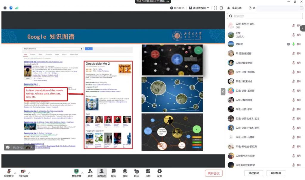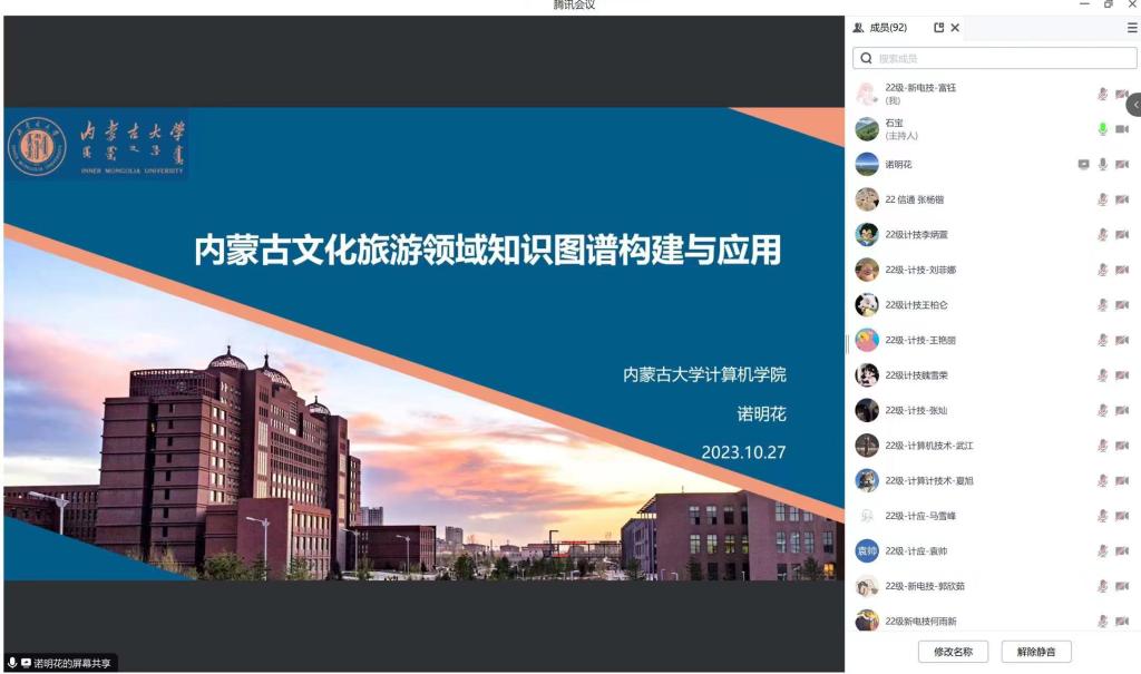 10月27日上午,河北工程大學信息與電氣工程學院副院長王巍教授、內蒙古大學的諾明花副教授分別為我院研究生做了題為“無人系統協同組網與輔助邊緣計算技術研究”、“內蒙古文化旅游領域知識圖譜構建與應用”兩場學術講座。兩位教授詳細講解了相關研究領域重點與難點問題,讓大家增長了知識,開拓了思路。