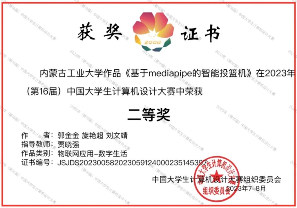 8月13日-8月17日,由賈曉強(qiáng)老師指導(dǎo),郭金金,旋艷超,劉文靖同學(xué)的作品“基于mediapipe的智能投籃機(jī)”榮獲第十六屆中國大學(xué)生計算機(jī)設(shè)計大賽,內(nèi)蒙古省級賽二等獎,國賽二等獎。