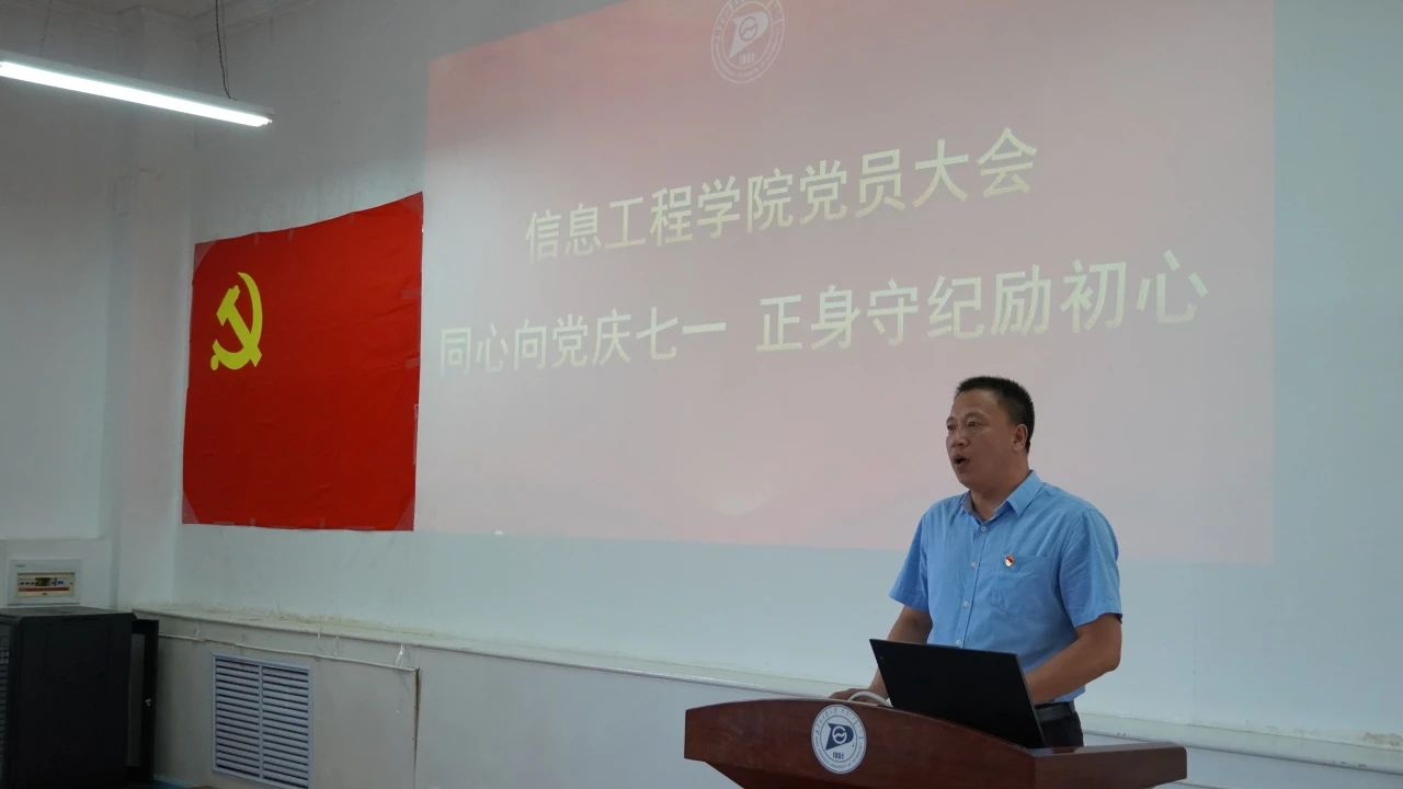 為慶祝中國共產(chǎn)黨成立103周年,大力弘揚(yáng)偉大建黨精神,6月27日下午,信息工程學(xué)院黨委在電力大樓十樓會(huì)議室召開“同心向黨慶七一,正身守紀(jì)礪初心”黨員大會(huì),全院師生黨員參會(huì)。