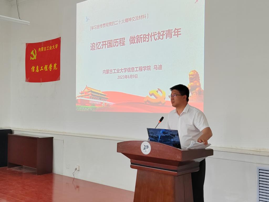 黨委書記烏迪圍繞“追憶開國歷程 做新時代好青年”這一課題進行詳細講解;院長黃平平結合信息類專業發展闡述了“弘揚‘兩彈一星’精神”的重要意義;黨委副書記、副院長佟姝婕以“新時代青年的使命”為題引導大家展開討論、學習;副研究員王彩玲組織大家認真學習“鑄牢中華民族共同體意識”;學院黨委委員許霞對端正大學生入黨動機和大學生入黨流程做了深入介紹;校外輔導員翟鶴重點給大家講解了如何發揮大學生黨員的先鋒模范作用。