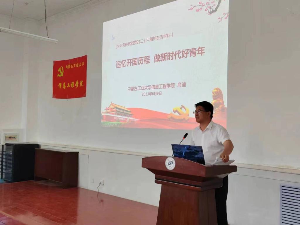 6月9日,信息工程學院黨委書記烏迪以“追憶開國歷程 做新時代好青年”為題,面向全院學生入黨積極分子講授主題教育專題黨課。