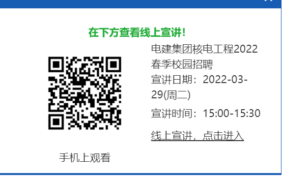 3.QQ群:應聘人員申請加入“中電建核電公司招聘群”,QQ群號:215704745,加群申請格式:畢業學校+專業+姓名。