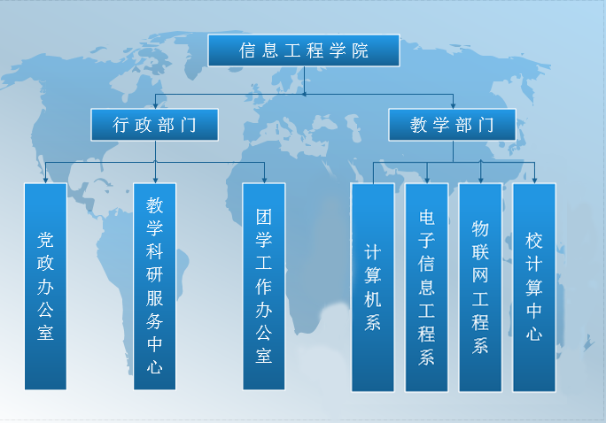 學院下設黨政辦公室、教學科研服務中心、團學工作辦公室3個行政部門,設有計算機系、電子信息工程系、物聯網工程系、校計算中心4個教學部門。